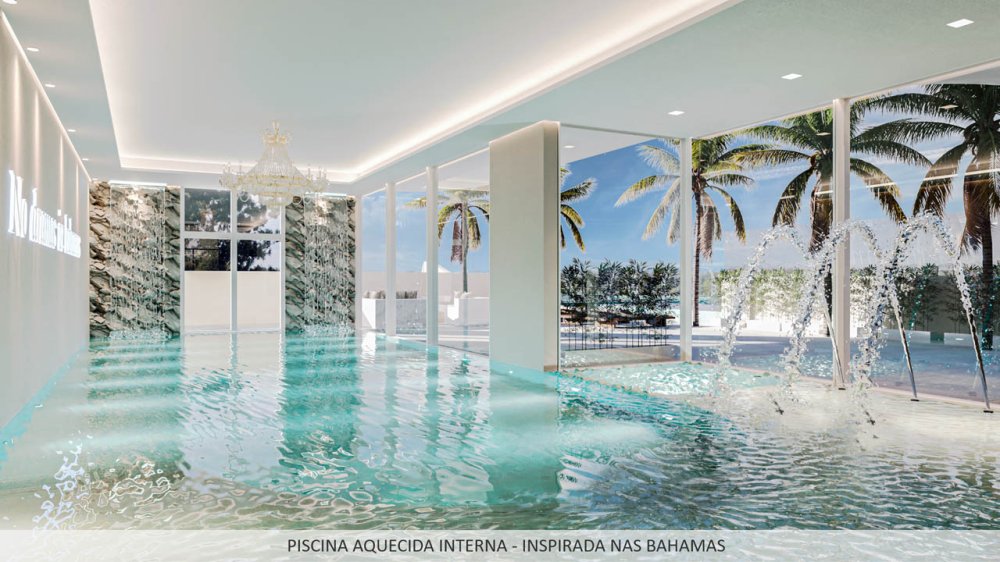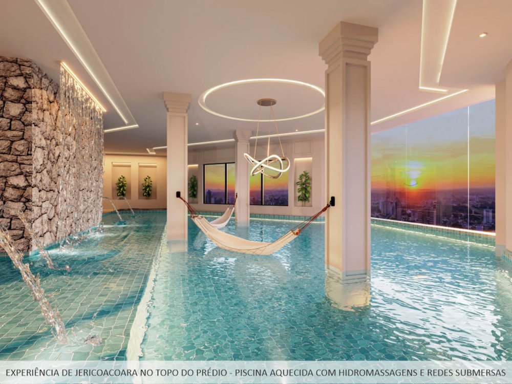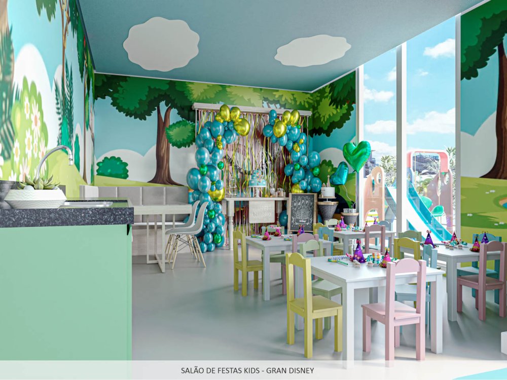 As áreas comuns são decoradas com acabamentos de alto padrão e oferecem uma variedade de espaços temáticos, desde uma piscina inspirada em Fernando de Noronha até uma brinquedoteca com tema de Gran Disney.